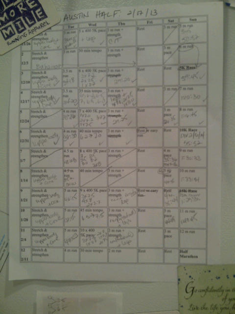 When I posted my training plan on the side of my refrigerator just before Thanksgiving, the whiteness of the blank boxes and the progression of long-run miles daunted me. For a couple of weeks, I doubted I could actually do it. Run a half marathon, geez. What was I thinking? I hadn’t run that far in so long I found it hard to have faith in my ability to do it again.